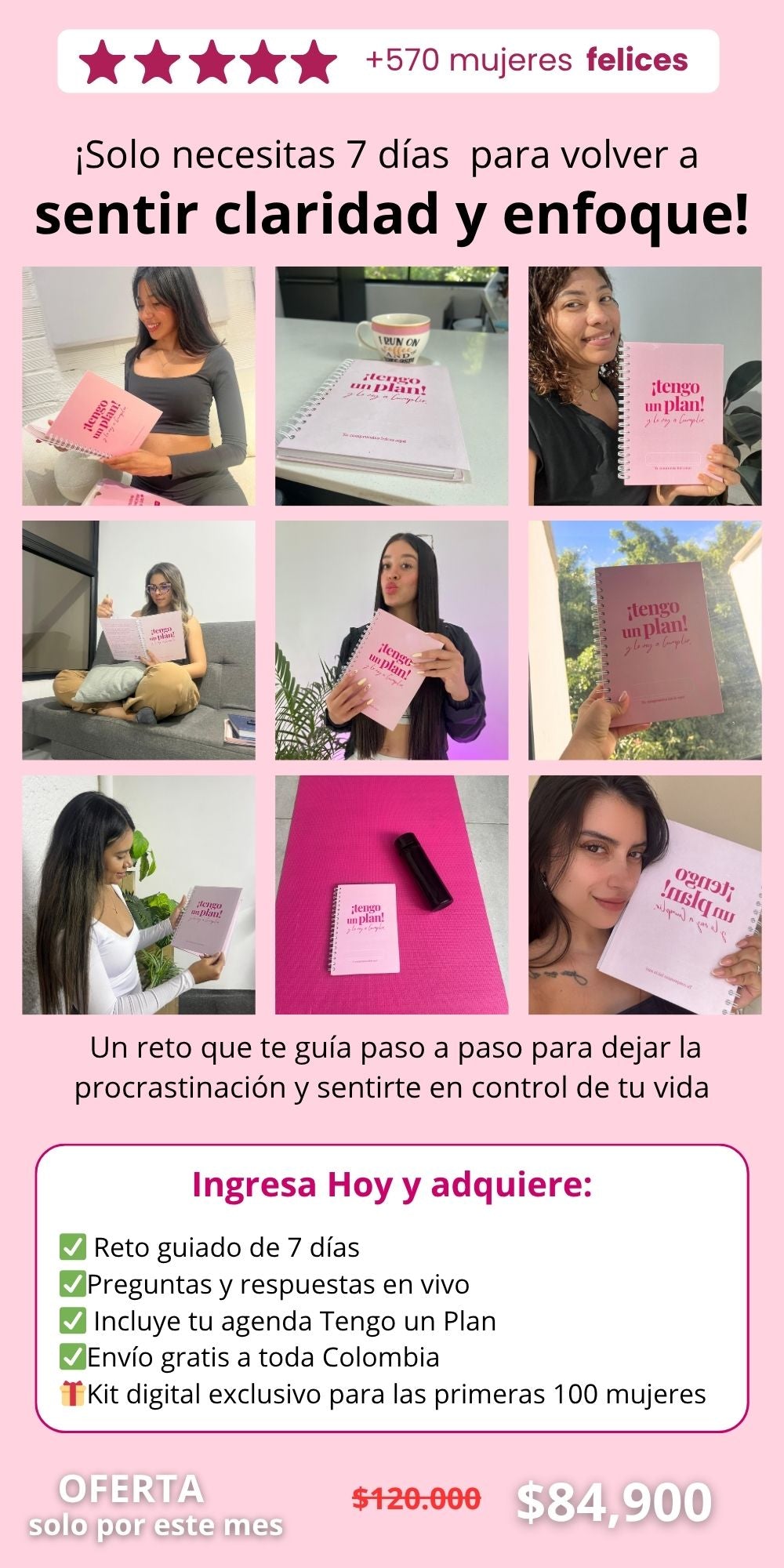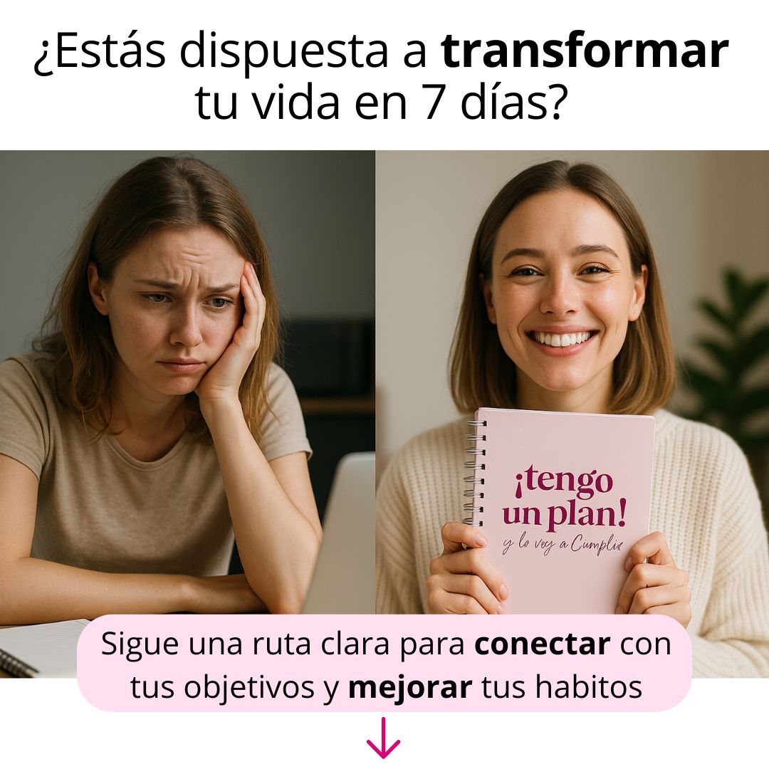 El reto incluye el acceso inmediato al Reto “7 días para volver a ti”, tu agenda física Tengo un Plan (con envío Gratis), y un kit digital exclusivo con ebooks y plantillas para acompañarte durante el proceso.